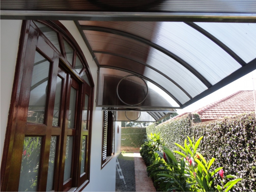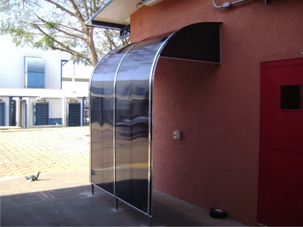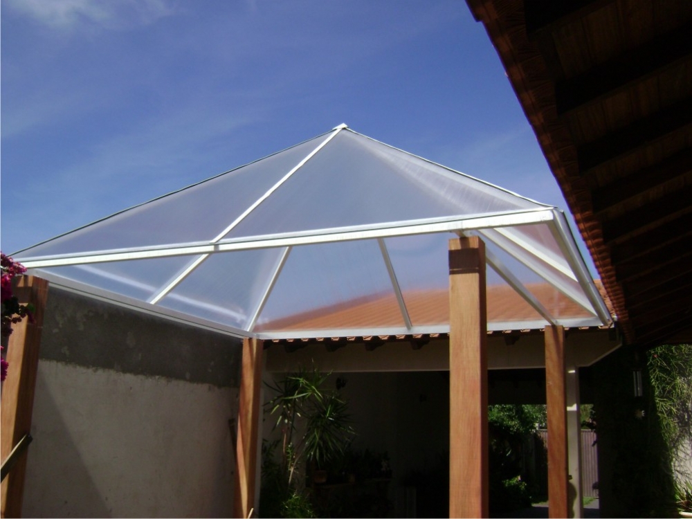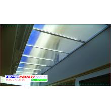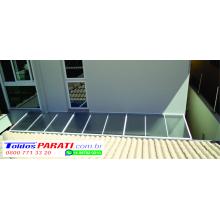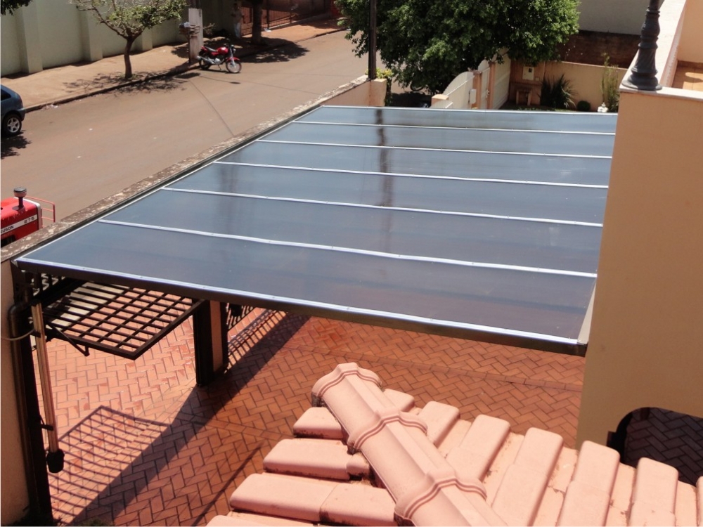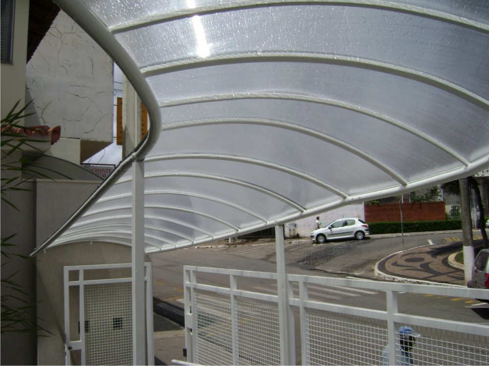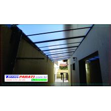 Chapa de Policarbonato Alveolar de 06 mm, possui similaridade ao vidro canelado, porém com uma combinação de diferenciais que o torna um produto muito superior, cor a escolher. Na fixação das chapas são utilizados fita VHB 19 mm, neoprene 38 mm, barra chata de alumínio 1 ½ x 1/8 fita micropore e cantoneira de alumínio 1 ½ x 1/8.