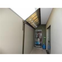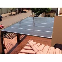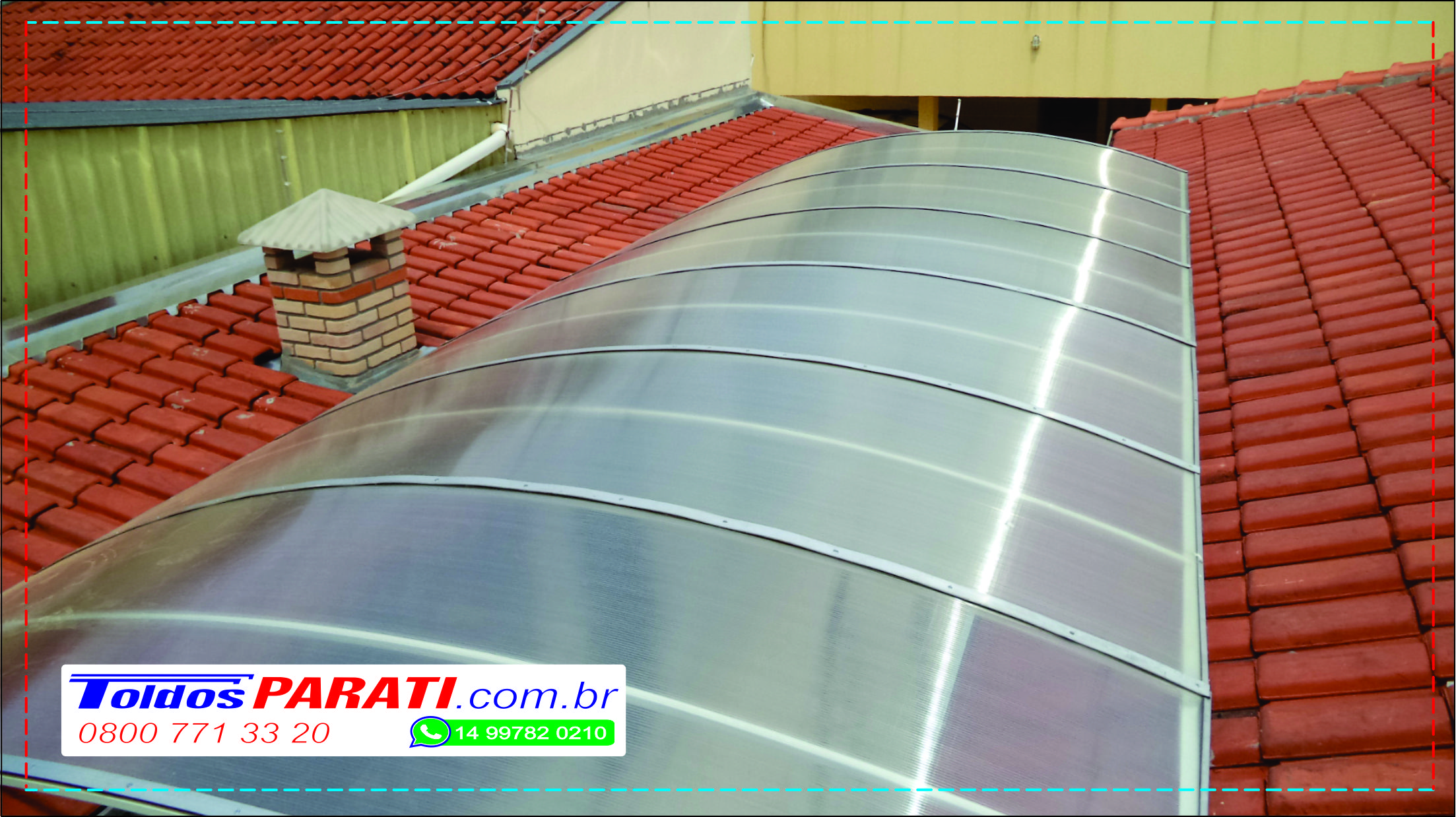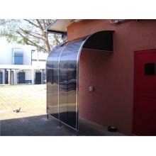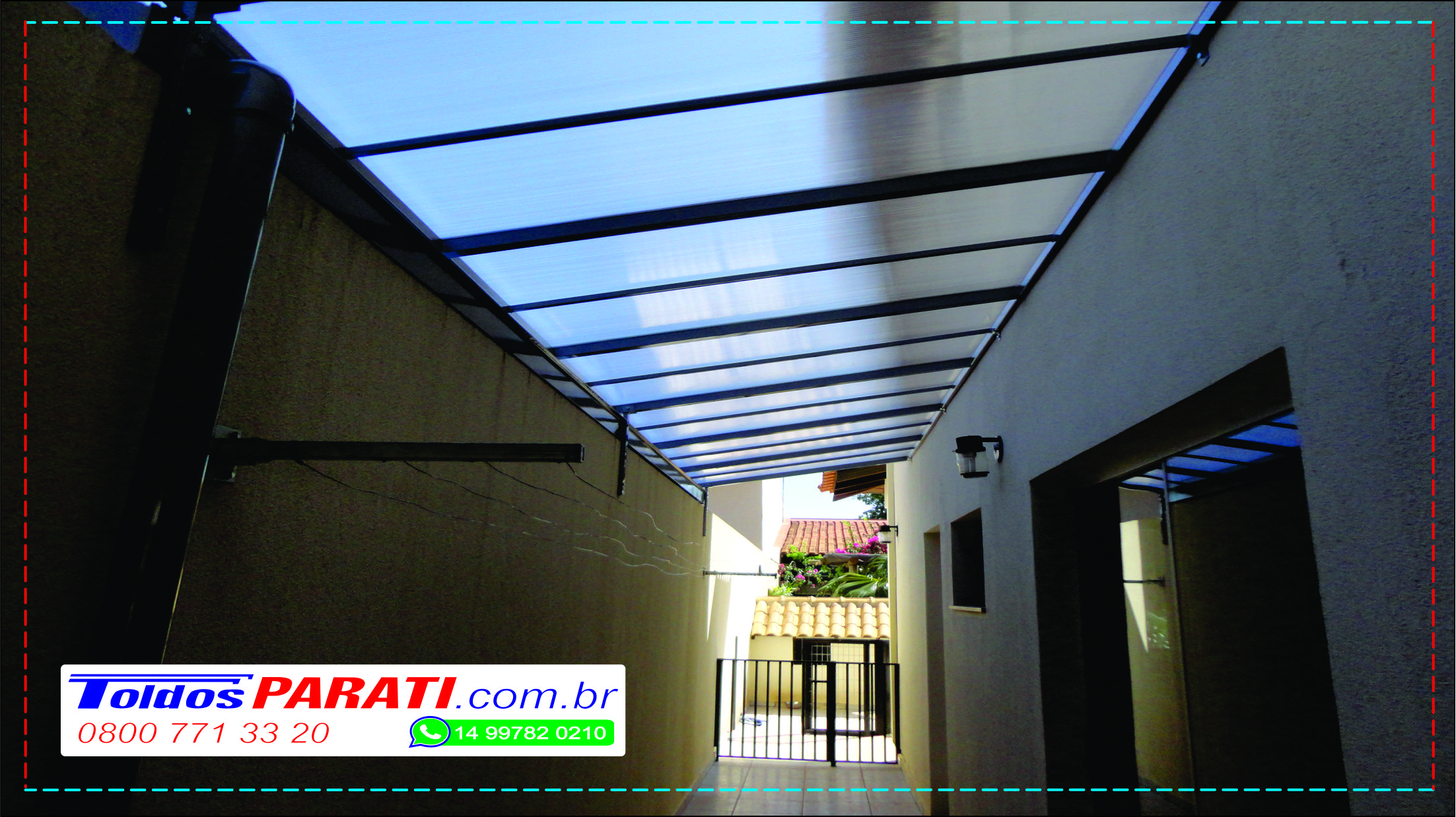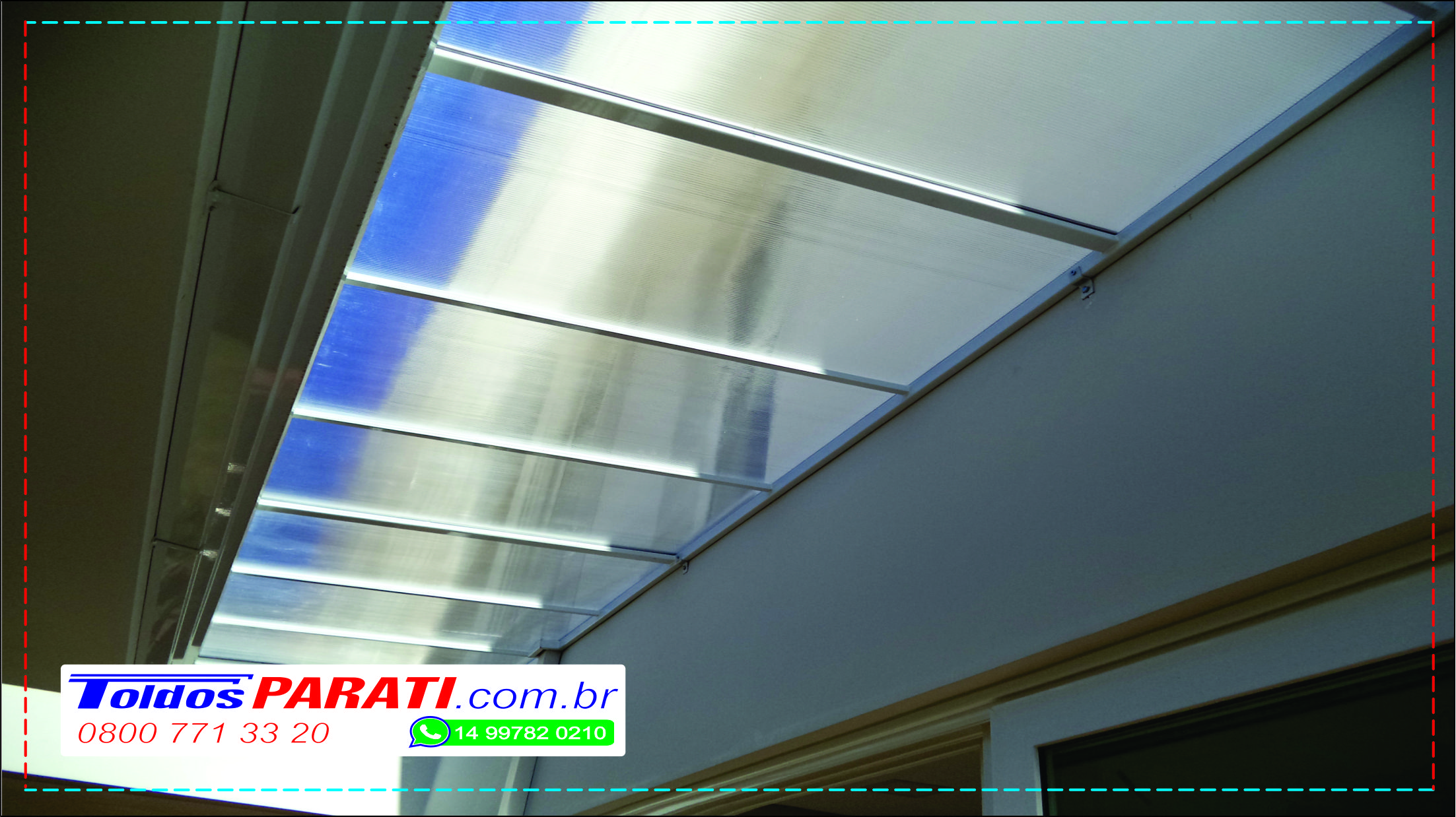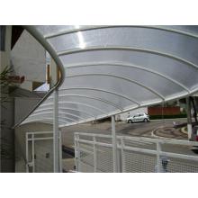Chapa de Policarbonato Alveolar de 06 mm, possui similaridade ao vidro canelado, porém com uma combinação de diferenciais que o torna um produto muito superior, cor a escolher. Na fixação das chapas são utilizados fita VHB 19 mm, neoprene 38 mm, barra chata de alumínio 1 ½ x 1/8 fita micropore e cantoneira de alumínio 1 ½ x 1/8.